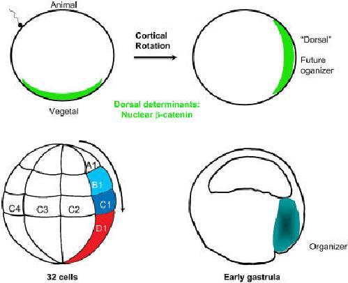 Figure 1. Early Development in X. laevisAfter fertilization, dorsal determinants are transported from the vegetal pole to one side of the embryo, where β-catenin will achieve nuclear localization. By 32 cells, the row of cells labeled 1 is specified as dorsal. Movements towards the vegetal pole (arrow) start at early cleavage stages. The organizer forms from C1 and B1 progenitors, the dorsal ectoderm or BCNE mostly from A1 progenitors (see Figure 2). The organizer is indicated in the gastrulaembryo. See the text for further explanation.