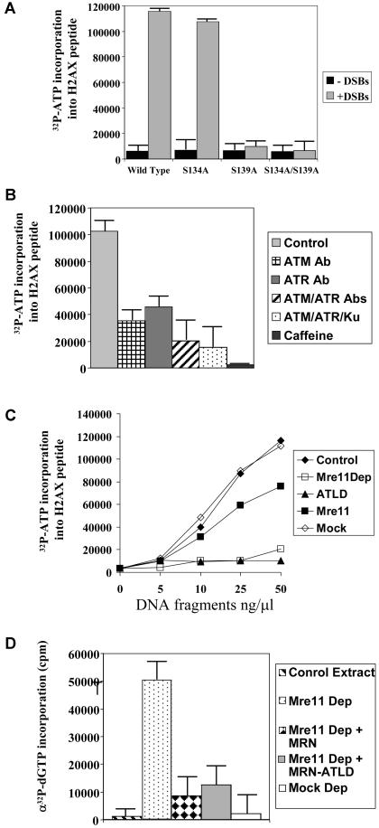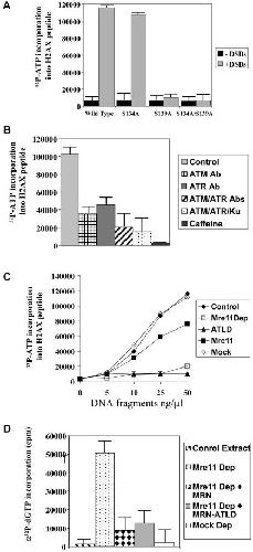 Figure 1. Functional MRN Is Required for the Response to DSBs, and Mre11âATLD Separates Essential and Nonessential Mre11 Functions(A) The activity of protein kinases responsive to DSBs in Xenopus laevis egg extracts was monitored by incorporation of 32P from γ-32P-ATP into H2AX-derived peptides in the presence (plus DSB) or absence (minus DSB) of fragmented DNA. Labels: Wild-Type, H2AX substrate peptide containing serine 134 and serine 139; S134A, H2AX substrate peptide with a substitution of serine 134 to alanine; S139A, H2AX substrate peptide with a substitution of serine 139 to alanine; S134A/S139A, H2AX substrate peptide with a substitution of both serines to alanine.(B) Extract incubated with linear DNA at 50 ng/μl (equivalent to 4.5 à 1010 breaks/μl) was assayed with H2AX peptide in the presence of buffer (Control), ATM-neutralizing antibodies (ATM Ab), ATR-neutralizing antibodies (ATR Ab), ATM- and ATR-neutralizing antibodies (ATM/ATR Abs), ATM- and ATR-neutralizing antibodies in Ku70-depleted extracts (ATM/ATR Abs; Ku depletion), 5 mM caffeine (Caffeine).(C) DSB-responsive kinase activity was measured in the presence of 0, 5, 10, 25, and 50 ng/μl of linear DNA in control extract (filled diamonds), mock-depleted extract (open diamonds), Mre11-depleted extract (open squares), Mre11-depleted extract supplemented with 500 nM of recombinant MRN (filled squares), or Mre11-depleted extract supplemented with 500 nM MRN-ATLD1/2 (filled triangles).(D) DSB accumulation during DNA replication was monitored by TUNEL assay. Postreplicative nuclei were isolated from a control extract (stripes), Mre11-depleted extract (dots), Mre11-depleted extract supplemented with MRN (diamonds), Mre11-depleted extract supplemented with MRN-ATLD1/2 (gray) or mock-depleted extract (white).