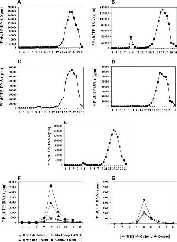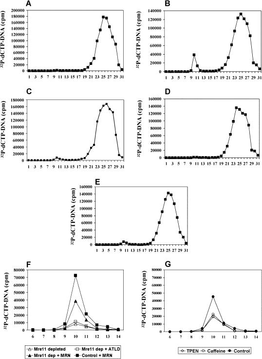 Figure 2. Requirements for the Assembly of DNA–Protein ComplexesElution profiles of α-32P-dATP-labeled 1 kb linear DNA from BioGel A15m chromatography columns. After loading, fractions 1–31 were collected and radioactivity was counted in a scintillation counter.(A–E) Complete elution profile. (A) Linear DNA alone. (B) Linear DNA incubated 2 h in extract at 22°C. (C) α-32P-dATP-labeled circular plasmid incubated for 2 h in extract at 22°C. (D) Linear DNA incubated with extract treated with 1 mg/ml proteinase K immediately prior to loading. (E) Linear DNA incubated in Mre11-depleted extract.(F and G) Excluded volume (fractions 6–14). (F) Linear DNA incubated in the following extracts: Mre11-depleted extract (open triangles), Mre11-depleted extract supplemented with 500 nM of MRN (filled triangles), Mre11-depleted extract supplemented with 500 nM of MRN-ATLD1/2 (open squares), or control extract supplemented with MRN (filled squares). (G) Linear DNA incubated in the following extracts: control extract (filled circles), extract treated with 5 mM caffeine (open circles), extract treated with TPEN at 100 μM (open diamonds).