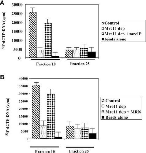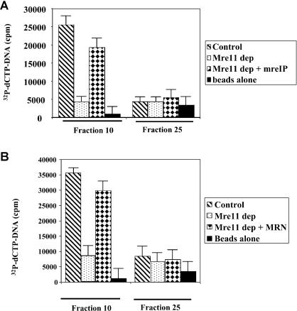 Figure 3. Mre11 Tethers DSB-Containing DNA(A) Control and treated extracts were incubated with α-32P-dATP-labeled DNA fragments and loaded onto BioGel A15 columns. Fractions 10 and 25 were collected and incubated with polyclonal antibodies against Mre11 or protein A beads alone. Beads were collected and washed, and radioactivity was counted in a scintillation counter. Shown are control extract (stripes), Mre11-depleted extract (dots), or Mre11-depleted extract supplemented with Mre11 that had been immunoprecipitated from the extract (diamonds), and extract incubated with beads alone (black).(B) Biotinylated DNA fragments were mixed with α-32P-dATP-labeled DNA fragments and incubated with various extracts. The extracts were then loaded onto BioGel A15 columns. Fractions 10 and 25 were collected and incubated with streptavidin-magnetic beads. Beads were collected and washed, and radioactivity was counted in a scintillation counter. Shown are control extract (stripes), Mre11-depleted extract (dots), Mre11-depleted extract supplemented with 500 nM MRN (diamonds), and streptavidin beads (black).