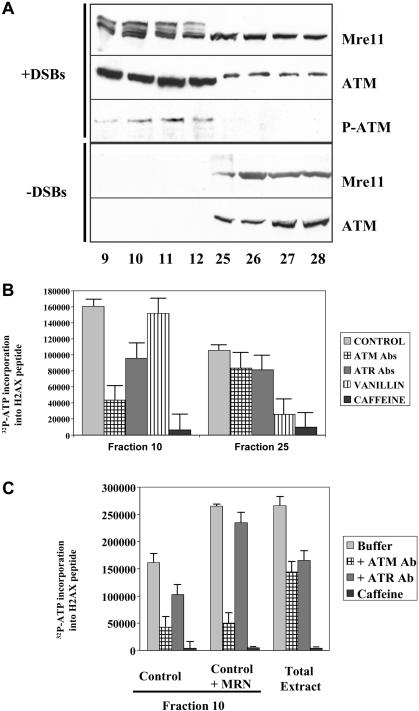 Figure 4. DNAâProtein Complexes Are Signaling Centers Containing Active Mre11 and ATM(A) Western blot analysis of eluted fractions. Fraction numbers are indicated at bottom. Fractions were collected following chromatography of extracts incubated with fragmented (plus DSBs) or without fragmented DNA (minus DSBs). Samples from fractions were processed for SDS-PAGE and blotted with polyclonal antibodies against Mre11, ATM, and phosphorylated ATM.(B) Activity of ATM and ATR kinases in fractions 10 and 25. Extracts were incubated with DNA fragments and applied to BioGel A15m columns. Fraction 10 and fraction 25 from control extract were assayed for H2AX activity in presence of buffer (light gray), ATM-neutralizing antibodies (checks), ATR-neutralizing antibodies (dark gray), 300 μM vanillin (stripes), or 5 mM caffeine (black).(C) Activity of ATM and ATR kinases in fraction 10 and total extract. Control extracts or extracts supplemented with 500 nM recombinant MRN were incubated with DSBs and loaded onto BioGel A15m columns. Total control extract and fraction 10 were assayed for H2AX activity in the presence of buffer (light gray), ATM-neutralizing antibodies (checks), ATR-neutralizing antibodies (dark gray), or 5 mM caffeine (black).
