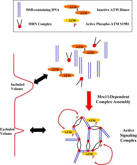 Figure 5. Schematic Representation of the Mre11-Dependent Assembly of DNA Damage Signaling ComplexesMRN promotes the assembly of DNA–protein structures containing linear DNA fragments enriched with active ATM molecules. These active signaling complexes resemble IRIF in that they are the morphological and functional unit of the DNA damage response.