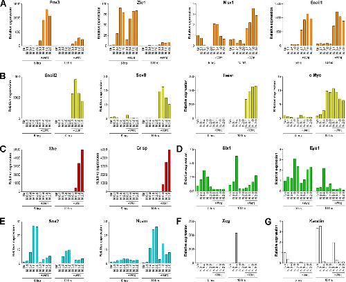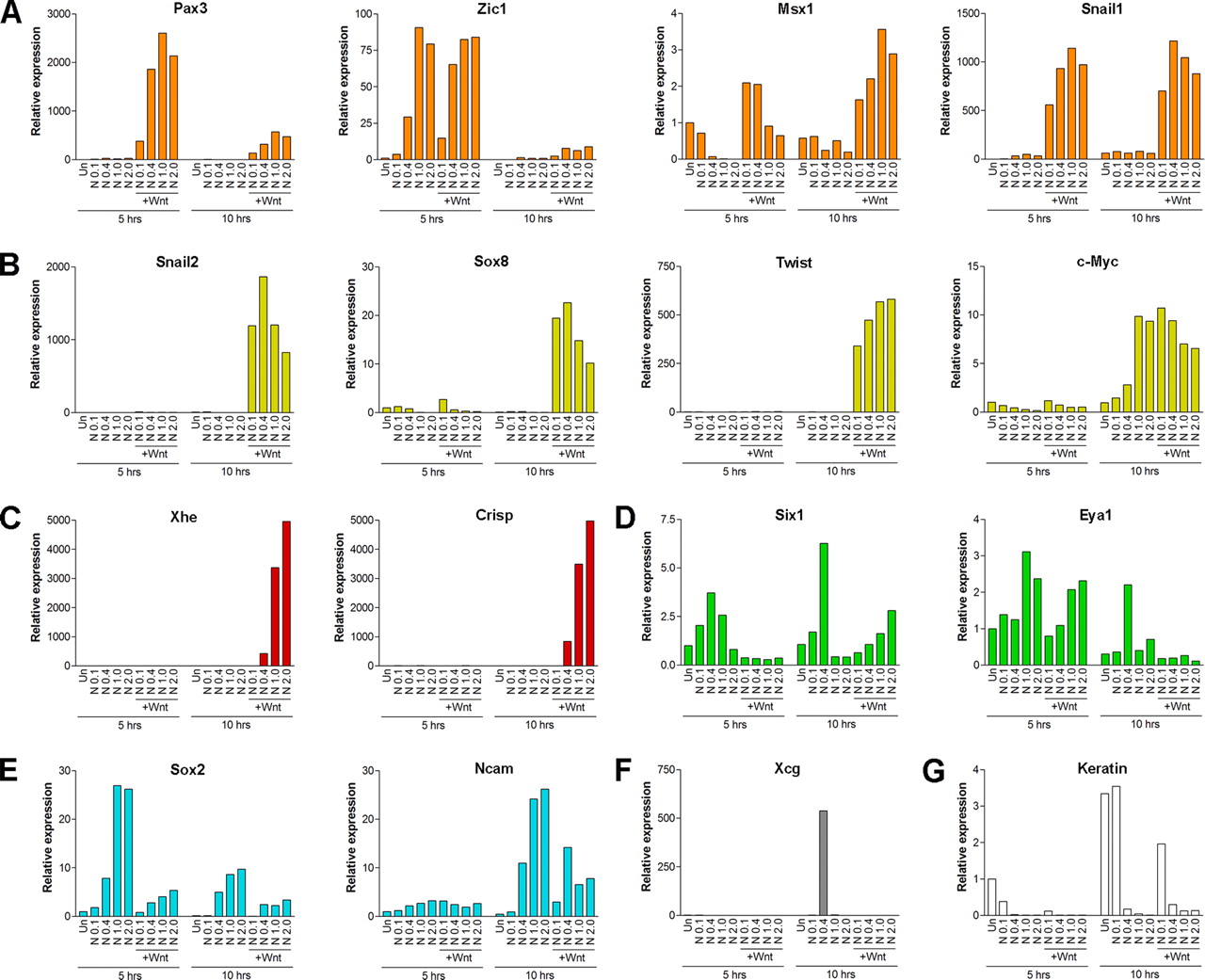Regulation of NPB cell fates by Bmp attenuation and Wnt signaling. Embryos at the two-cell stage were injected in the animal pole with increasing doses of Noggin (N) mRNA (0.1, 0.4, 1.0, and 2.0 ng) alone or in combination with Wnt1 (+Wnt) mRNA (100 pg). Animal explants were dissected at the blastula stage, cultured for 5 or 10 h, and analyzed by real-time RT-PCR for the expression of four putative NPB specifiers, Pax3, Zic1, Msx1, and Snail1 (A), and a number of cell type-specific genes: Snail2, Sox8, Twist, and cMyc for NC (B); Xhe and Crisp for HG (C); Six1 and Eya1 for PE (D); Sox2 and Ncam for neural plate (E); Xcg for cement gland (F); and Keratin for epidermis (G). Un, uninjected animal explant. Each value was normalized to the level of EF1α expression.