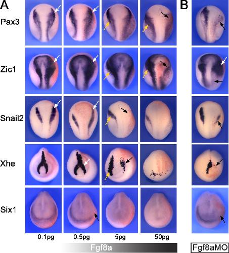 Regulation of cell fates at the NPB by Fgf8 signaling. (A) Embryos injected with increasing amounts of Fgf8a mRNA (0.1, 0.5, 5, and 50 pg) in one blastomere at the two-cell stage and analyzed by whole-mount in situ hybridization for Pax3, Zic1, Snail2, Xhe, and Six1 expression. Pax3, Zic1, Snail2, and Xhe are expanded on the injected side by lower doses of Fgf8 (0.1 or 0.5 pg; white arrows). The expression of these genes is expanded on the contralateral side (yellow arrows) and repressed on the injected side (black arrows) for higher doses of Fgf8a (5 or 50 pg). Six1 expression is repressed unilaterally or bilaterally for intermediate (0.5 pg) or high (5 and 50 pg) doses of Fgf8a, respectively. (B) Embryos injected with Fgf8a-specific morpholino (Fgf8aMO) in the marginal zone of four-cell stage embryos exhibit a strong reduction of Pax3, Snail2, Xhe, and Six1 expression at the neurula stages (black arrows). In the absence of Fgf8a function, Zic1 anterior expression domain is expanded (white arrow), whereas posteriorly Zic1 is reduced (black arrow). In A and B, embryos hybridized with Pax3, Zic1, and Snail2 are viewed from the dorsal side, anterior to top. Anterior views are shown for embryos hybridized with Xhe and Six1. In all panels, the injected side is on the right.