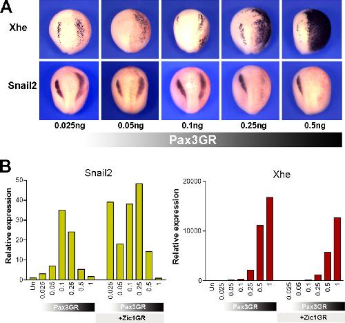 Distinct thresholds of Pax3 activity regulate HG and NC fates. (A) Embryos injected with increasing amounts of Pax3GR mRNA in one blastomere at the two-cell stage and treated with dexamethasone at the gastrula stage were analyzed by whole-mount in situ hybridization for Xhe and Snail2 expression at stage 17. Although Snail2 is expanded laterally and anteriorly by lower doses of Pax3GR, Snail2 is repressed for higher doses of Pax3GR. Ectopic expression of Xhe is proportional to the amount of Pax3GR mRNA injected. Dorsal views, anterior to top. In all panels, the injected side is on the right. (B) In animal explants, the induction of Snail2 and Xhe as determined by real-time RT-PCR depends on different amounts of injected Pax3GR. Zic1GR strongly synergizes with Pax3 to induce Snail2. The concentrations of Pax3GR mRNA injected are in nanograms. A single dose of Zic1GR mRNA (0.25 ng) was coinjected as indicated.
