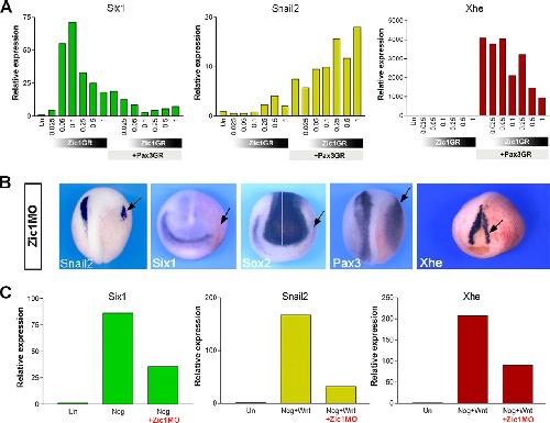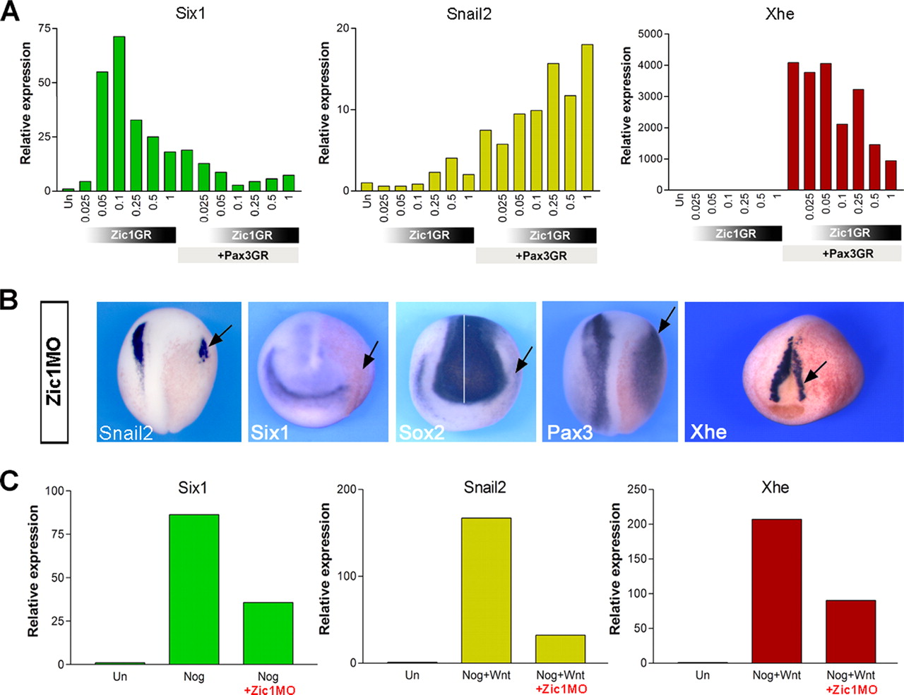 Zic1 promotes the expression of Six1 an activity repressed by Pax3. (A) In animal explants, Zic1GR is sufficient to activate Six1 expression as determined by real-time RT-PCR. Pax3GR strongly represses Zic1-mediated Six1 induction to promote NC (Snail2) and HG (Xhe) fates. The concentrations of Zic1GR mRNA injected are in nanograms. A single dose of Pax3GR mRNA (0.25 ng) was coinjected as indicated. (B) Embryos injected with Zic1 morpholino (Zic1MO) exhibit a strong reduction of Snail2 and Six1 (arrows). The neural plate expression of Sox2 is expanded, whereas Sox2 PE expression domain is reduced (arrow). In these embryos lacking Zic1 function, Xhe expression is altered (arrow), presumably as a consequence of reduced Pax3 expression (arrow). Embryos are viewed from the dorsal side, anterior to top (Snail2 and Pax3). In Six1, Sox2, and Xhe staining, anterior views are shown, dorsal to top. The injected side is indicated by an arrow. (C) Noggin-mediated induction of Six1 is inhibited in the absence of Zic1 function (+Zic1MO). Noggin+Wnt activates expression of Snail2 and Xhe in animal explants, an activity that is inhibited by coinjection of Zic1MO.
