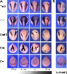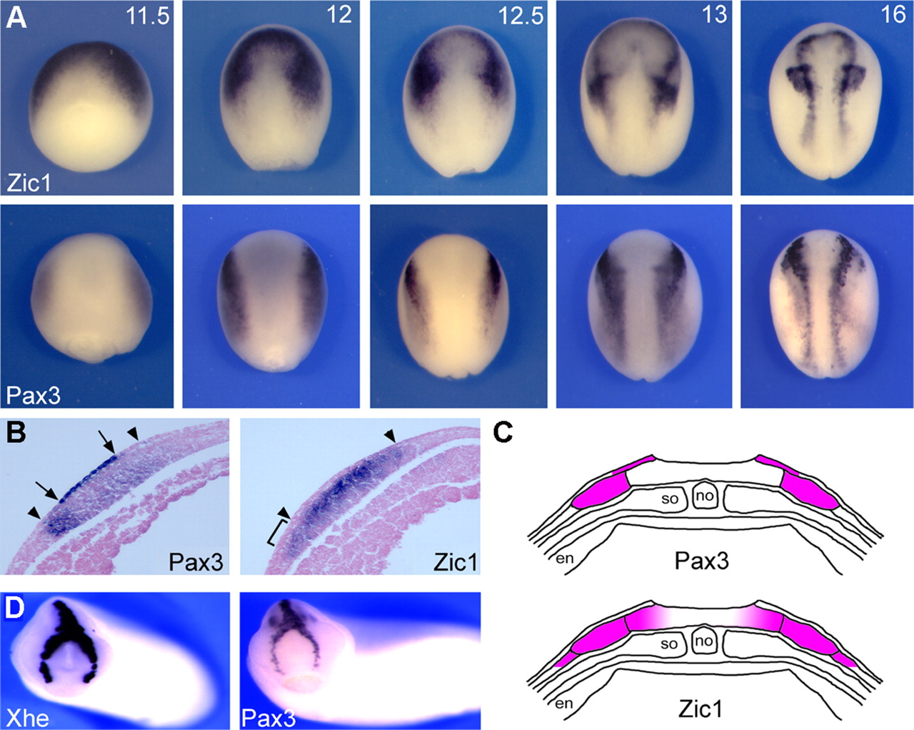 Expression of Pax3 and Zic1 at the NPB. (A) Developmental expression of Pax3 and Zic1 at the NPB in stage-matched embryos (the stages are indicated in the top right corner). Dorsal views, anterior to top. (B) Transverse section through neurula stage embryos illustrating the relative position of Pax3 and Zic1 in the deeper layer of the ectoderm (arrowheads). Pax3 is also detected in the superficial layer of the ectoderm (arrows), and Zic1 expression domain expands more laterally (bracket) than Pax3. (C) Schematic representation of cross-sections through neurula stage embryo showing the domain of expression of the Pax3 and Zic1 (purple). (D) Xhe and Pax3 are coexpressed in the HG at the tailbud stage. Frontal views.