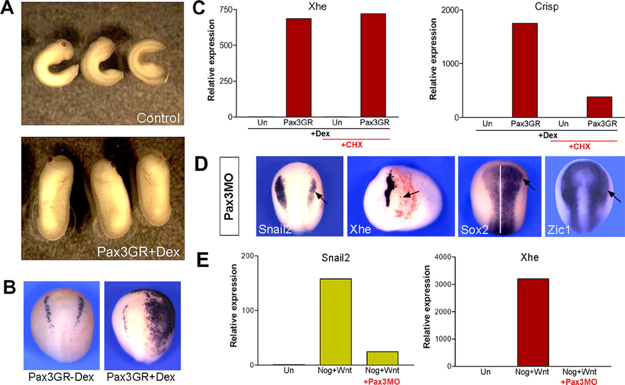 Pax3 is sufficient and required to promote HG fate. (A) Embryos injected with Pax3GR and treated with dexamethasone at the gastrula stage hatch several hours earlier than their uninjected siblings. (B) Stage 17 embryo that received unilateral injection of Pax3GR at the two-cell stage and treated with dexamethasone (+Dex) exhibit a strong ectopic expression of Xhe on the injected side (right side), whereas sibling embryos cultured in the absence of dexamethasone (âDex) are unaffected. Dorsal views, anterior to top. (C) In animal explants, Pax3GR strongly induces Xhe and Crisp expression 4 h after dexamethasone treatment (+Dex). Pax3-mediated induction of Xhe occurs independently of protein synthesis (+CHX). Another HG-specific gene, Crisp, is significantly reduced in the absence of protein synthesis. (D) Embryos injected with Pax3 morpholino (Pax3MO) exhibit a strong reduction of Snail2 and Xhe expression at the neurula and tailbud stages, respectively (arrows). Sox2 and Zic1 expression were expanded in Pax3-depleted embryos (arrows). Embryos hybridized with Snail2, Sox2, and Zic1 are viewed from the dorsal side, anterior to top. For Xhe staining, anterior view is shown. In all cases, the injected side is indicated by an arrow. (E) Noggin+Wnt activates expression of Snail2 and Xhe in animal explants, an activity that is inhibited by coinjection of Pax3MO.