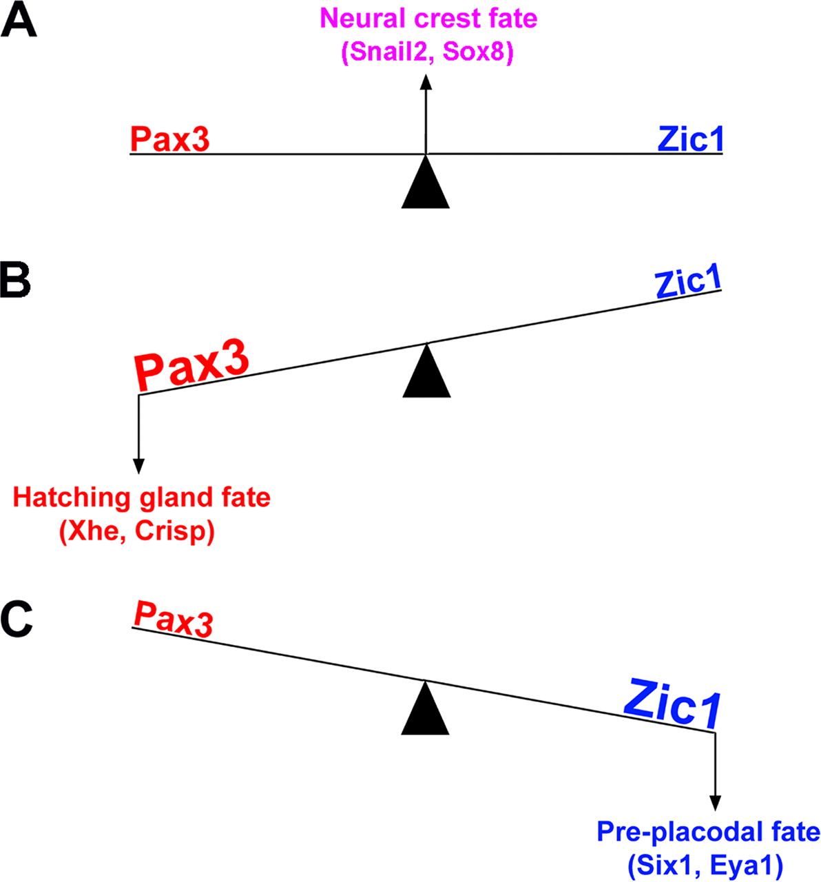 Model for the specification of NPB cells. In response to Bmp, Wnt, and Fgf signaling, the transcription factors Pax3 and Zic1 are activated at the NPB. The activity of these two factors regulates the specification of three NPB cell populations. When Pax3 and Zic1 reach an appropriate balance, NC is induced (A). Variations in the relative activity of these two transcriptional regulators at the NPB can disrupt this balance, either toward Pax3 to promote HG formation (B) or toward Zic1 to promote PE fate (C).