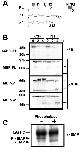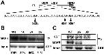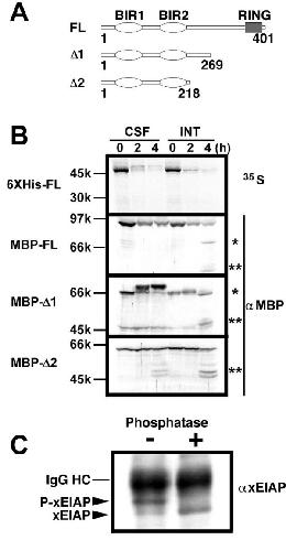 Figure 1. Phosphorylation-dependent electrophoretic mobility shift of xEIAP/XLX in CSF-arrested egg extracts. (A) Schematic models of recombinant proteins used in this study. (B) Time-dependent changes of recombinant proteins incubated in CSF-arrested (CSF) and interphase (INT) egg extracts. 35S-radiolabeled 6XHis-FL, MBP-FL, MBP-Δ1, and MBP-Δ2 were mixed with either CSF-arrested or interphase egg extracts and incubated for indicated time periods (0, 2, and 4 h). After separation by SDS-PAGE, radiolabeled and MBP-fused recombinants were detected by image analyzer and Western blot, respectively. Molecular weights of standard proteins are indicated at the left. The larger (~70 k) and smaller cleavage products (50–55 k) of MBP-fusions are indicated by single and double asterisks, respectively. (C) Phosphorylation-dependent electrophoretic mobility shift of xEIAP/XLX. Endogenous xEIAP/XLX in CSF-arrested egg extracts were retrieved by antibody-coated beads and incubated with (+) or without (-) calf intestine alkaline phosphatase. After separation by SDS-PAGE, xEIAP/XLX was detected by Western blot. Positions of phosphorylated (P-xEIAP) and unphosphorylated (xEIAP) forms of xEIAP/XLX are indicated by arrowheads. The position of IgG heavy chain (IgG HC) is indicated by the line.