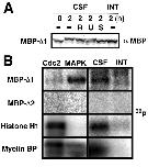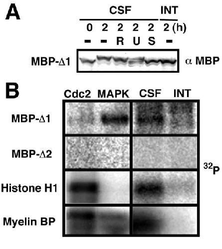 Figure 2. Phosphorylation of xEIAP/XLX by p42MAPK in CSF-arrested egg extracts. (A) The effects of kinase inhibitors. MBP-Δ1 was incubated in CSF-arrested (CSF) and interphase (INT) egg extracts, respectively, with or without the indicated kinase inhibitors (R, 100 μM roscovitine; U, 100 μM U0126; S, 10 μM staurosporine) for indicated time periods (0 and 2 h). After separation by SDS-PAGE, MBP-Δ1 was detected by Western blot. (B) Phosphorylation of xEIAP/XLX by p42MAPK and CSF-arrested egg extracts. MBP-Δ1, MBP-Δ2, and control substrates Histone H1 and myelin basic protein (Myelin BP) were incubated with Cdc2/Cyclin B2 (Cdc2), p42MAPK (MAPK), CSF-arrested (CSF) egg extracts, or interphase (INT) egg extracts in the presence of [γ-32P] ATP. After separation by SDS-PAGE, incorporated radioactivity was detected by image analyzer.