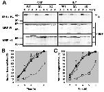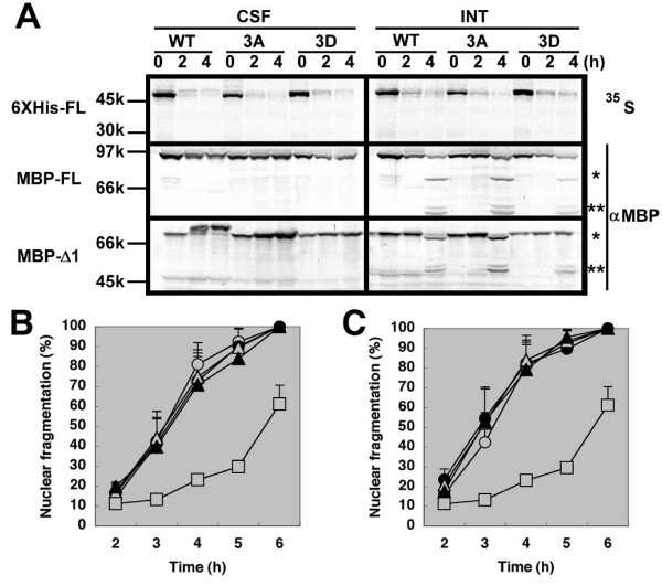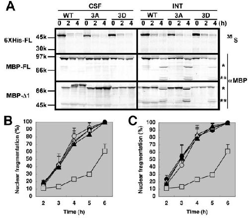 Figure 4. Phosphorylation of Ser235/251/254 affects neither protein stability nor apoptosis-inhibiting activity of xEIAP/XLX. (A) Stability and electrophoretic mobility shift of xEIAP/XLX. The WT/3A/3D forms of 35S-radiolabeled 6XHis-FL, MBP-FL, and MBP-Δ1 were incubated in CSF-arrested (CSF) or interphase (INT) egg extracts for indicated time periods (0, 2, and 4 h). After separation by SDS-PAGE, radiolabeled and MBP-fused recombinants were detected by image analyzer and Western blot, respectively. Molecular weights of standard proteins are indicated at the left. The larger (~70 k) and smaller cleavage products (50–55 k) of MBP-fusions are indicated by single and double asterisks, respectively. (B) Apoptosis inhibition by MBP-FL. (C) Apoptosis inhibition by MBP-Δ1. In (B) and (C), nuclear fragmentation assays were carried out as previously described [11]. Open circles, MBP (negative control); closed circles, WT; open triangles, 3A; closed triangles, 3D; open squares, MBP-xXIAP (positive control). Data are represented as mean + S.E.M. (N = 5).