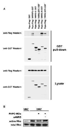 Figure S5. C-Terminal Ankyrin Repeats Domain of xANR5 Is Required for Its Physical Association with PAPC (A) The physical interaction between GST-fused xANR5 and PAPCflag was tested by a pull-down assay, followed by western blotting. To address which domain of xANR5 is important for its interaction with PAPC, we also tested the interaction between GST-fused xANR5 variants and PAPC-flag. The expression of xANR5 and its variants was detected with a mouse anti-GST antibody and HRP-conjugated mouse anti-IgG antibody. PAPC expression was detected by a rabbit anti-flag antibody followed by HRP-conjugated rabbit anti-IgG antibody. We confirmed that xANR5 and PAPC are binding partners and identified the C-terminal ankyrin repeats domain as being important for the physical interaction of xANR5 and PAPC. (B) A Rho activation assay was carried out in the DMZ to examine whether xANR5 could rescue the Rho activity downregulated by PAPC-MOs injection. Microinjection of PAPC-MOs into the dorsal region suppressed the endogenous Rho activity. We found that the coinjection of xANR5 could completely rescue the effect of the PAPC-MOs. The Rho activity in the DMZ was higher than that in the VMZ, as previously reported.