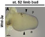 wnt3a (wingless-type MMTV integration site family, member 3A ) gene expression in Xenopus laevis embryo, assayed via in situ hybridization, NF stage 52 hindlimb bud, lateral view, posterior up, anterior down.
