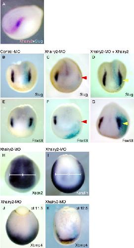 Figure 1. Xhairy2 is required for neural crest marker gene expression. A: Double in situ hybridization with Xhairy2 (magenta) and Slug (blue) at stage 13. B,E: Control-MO injection has no effect on any of the neural crest markers examined at stage 13: Slug (B) and FoxD3 (E). C,F: In embryos injected with Xhairy2-MO, the expression of Slug (C) and FoxD3 (F) is inhibited on the injected side (red arrowhead) at stage 13. D,G: Loss of neural crest marker expression in embryos injected wit Xhairy2-MO is rescued by injecting 20 pg of Xhairy2 mRNA (yellow arrowhead): Slug (D) and FoxD3 (G). H,I: In embryos injected with Xhairy2-MO, the expression of Xsox2 (H) and Keratin (I) is not apparently affected at stage 13. White brackets indicate the width of the neural plate. J,K: In embryos injected with Xhairy2-MO, Xbmp4 expression is not affected at stages 11.5 (J) and 12.5 (K). A, lateral views with anterior to the left. B, dorsal views with anterior to the bottom. Injected area is the right side. Turquoise staining is lineage tracer β-gal.