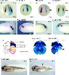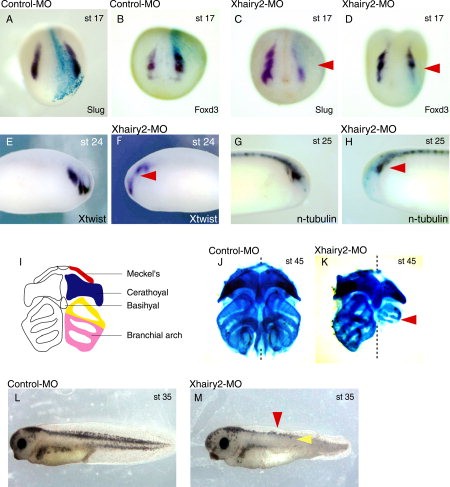 Figure 2. Depletion of Xhairy2 leads to loss of neural crest derivatives. A,B: Control-MO injection has no effect on any of the neural crest markers examined at stage 17: Slug (A) and FoxD3 (B). C,D: In embryos injected with Xhairy2-MO, the expression of Slug (C) and FoxD3 (D) in inhibited on the injected side (red arrowhead) at stage 17. E,F: Compared with the control side (E), the Xhairy2-MO injected side shows reduced migratory neural crest cells (F) as depicted by Xtwist expression (red arrowhead) at stage 24. G,H: Compared with the control side (G), the Xhairy2-depleted embryo shows no cranial sensory ganglia on the injected side (H) as depicted by n-tubulin expression (red arrowhead) at stage 25. I: Schematic diagram depicting ventral cranial cartilages of a stage 45 embryo. J: Cartilage staining of Control-MO injected embryo shows normal structures at stage 45. K: Cartilage staining of Xhairy2-MO injected embryo shows partial loss of cartilage on the injected side (red arrowhead) at stage 45. L,M: Phenotypes of stage 35 embryos whose bilateral trunk neural crest was injected with Control-MO or Xhairy2-MO. Melanocytes of Xhairy2-MO injected embryo are reduced (M; yellow arrowhead) compared with Control-MO injected embryo (L). L: The dorsal fin of Control-MO injected embryo shows normal structures M: The dorsal fin of Xhairy2-MO injected embryo shows partial loss (red arrowhead). A, dorsal views with anterior to the bottom. E,G, lateral views with anterior to the right. F, H, L, M, lateral views with anterior to the left. J, K, ventral views with anterior to the top. A,J,K, injected area is the right side. Turquoise staining is lineage tracer β-gal.
