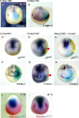 Figure 3. Depletion of Xhairy2 induces ectopic p27xic1 and X-Delta-1 expression in presumptive neural crest. A,B: Xhairy2-MO induces slight increases of n-tubulin expression at stage 15 (A) and X-ngnr-1 expression at stage 13 (B) in trigeminal ganglia. C: Control-MO injection has no effect on p27xic1 expression at stage 13. D: In embryos injected with Xhairy2-MO, ectopic expression of p27xic1 is induced on the injected side (red arrowhead) at stage 13. E: The ectopic expression of p27xic1 is repressed by injecting 20 pg of Xhairy2 mRNA (yellow arrowhead). F: Control-MO injection has no effect on X-Delta-1 expression at stage 13. G: Xhairy2-MO induces a modest increase of X-Delta-1 expression in the cranial neural crest region (red arrowhead) at stage 13. H: The modest increase of X-Delta-1 expression is repressed by injecting 20 pg of Xhairy2 mRNA (yellow arrowhead). I: Double in situ hybridization with Xhairy2 (blue) and p27xic1 (magenta) at stage 12. J: Double in situ hybridization with Xhairy2 (blue) and p27xic1 (magenta) at stage 13. Dorsal views with anterior to the bottom. Injected area is the right side. Turquoise staining is lineage tracer β-gal.