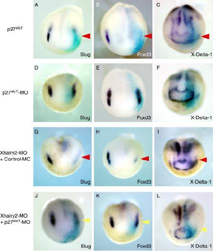 Figure 4. Repression of p27xic1 expression by Xhairy2 is involved in early neural crest specification. A,B: Embryo injected with 10 pg of p27xic1 mRNA shows repression of Slug (A) and Foxd3 (B) expression (red arrowhead). C: The injection of 10 pg of p27xic1 mRNA produces a slightly increase of X-Delta-1 expression on the lateral side of the neural plate (red arrowhead). D: p27xic1-MO injection has no effect on X-Delta-1 expression (F) or any of the neural crest markers examined: Slug (D) and Foxd3 (E). G,H,J,K: The repression of early neural crest marker expression by Xhairy2-MO seems to be rescued by p27xic1-MO injection (yellow arrowhead): Slug (J) and Foxd3 (K), but not by Control-MO injection (red arrowhead): Slug (G) and Foxd3 (H). I,L: The mild increase of X-Delta-1 expression by Xhairy2-MO seems to be rescued by p27xic1-MO injection (L) but not by Control-MO injection (I). Dorsal views with anterior to the bottom at stage 13. Injected area is the right side. Turquoise staining is lineage tracer β-gal.