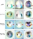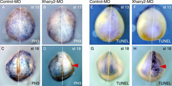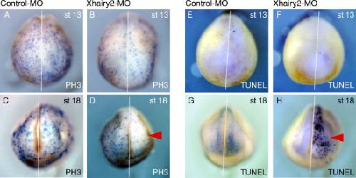 Figure 5. Xhairy2 is required for cell proliferation and survival in neural crest. A: Phosphohistone H3 immunohistochemistry of Xhairy2-MO or Control-MO injected embryos. A,C: There is no detectable difference in the number of actively cycling cells between the side injected with Control-MO and the uninjected side at stages 13 (A) and 18 (C). B: There is no detectable difference in the number of actively cycling cells between the side injected with Xhairy2-MO and the uninjected side at stage 13. D: The number of actively cycling cells is decreased in the neural crest region injected with Xhairy2-MO (red arrowhead), compared with the uninjected side at stage 18. E: TUNEL staining of Xhairy2-MO or Control-MO injected embryos. E,G: There is no detectable difference in the number of apoptotic cells between the side injected with Control-MO and the uninjected side at stages 13 (E) and 18 (G). F: There is no detectable difference in the number of apoptotic cells between the side injected with Xhairy2-MO and the uninjected side at stage 13. H: A significant increase in the number of apoptotic cells is observed on the side injected with Xhairy2-MO (red arrowhead), compared with the uninjected side at stage 18. Dorsal views with anterior to the bottom. Injected area is the right side.