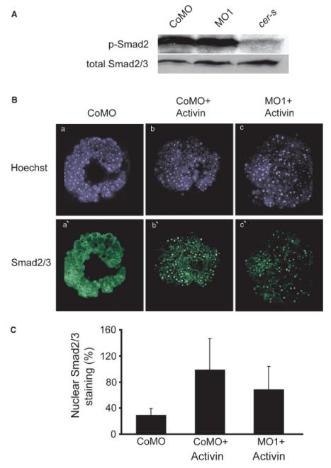 Fig. 5 Smad2 phosphorylation and nuclear translocation are unaffected by Dkk3 depletion. (A) One- to two-cell-stage embryos were injected with 25 ng CoMO or dkk3 MO1, and the levels of phospho-Smad2 (pSmad2) and total Smad2/3 were analyzed by Western blot. (B) One- to two-cell-stage embryos were injected with 50 ng CoMO or dkk3 MO1, and animal caps were explanted at stage 9 and treated with Activin protein for 30 min. Animal caps were stained for nuclei with Hoechst (aâc) and analyzed by immunofluorescence for endogenous Smad2/3 (a0âc0). (C) Quantitation of Smad2/3 staining in Hoechst-positive nuclei.