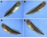 Fig. 3 (Right). MyoS is required for hypaxial muscle differentiation. MyoS-MO (A,C) or Control (C)-MO (B,D) were injected at a level of 20 ng into each blastomere at the 2-cell stage. (A,B) Staining with 12/101 antibody at stage 39. (C,D) In situ hybridization with MyoS probe at stage 33/34. Strong reduction or complete absence of antibody staining was seen in 31/31 MyoS-MO-injected embryos (A), while 34/37 C-MO- injected embryos showed intense staining equivalent to that in uninjected embryos (B); three separate experiments were carried out. Using MyoS staining, 27/27 embryos showed strong suppression (C), while 35/36 C- MO-injected embryos showed normal expression (D).