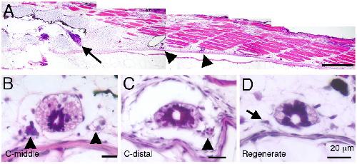 Figure 2. Morphology of the spinal ganglia viewed by haematoxylin-eosin staining. (A) A parasagittal section of the dorsal root ganglia in a stage 49 Xenopus tadpole is shown. The black arrow indicates ganglion 9. (B-D) Transverse sections of middle (B), distal (C) and regenerated (D) Xenopus tails. Arrow heads indicate the spinal ganglia in (B, C) and the arrow in (D) shows a "sporadic ganglion cell" in a regenerate. Scale bars: 500 μm in (A), 20 μm in (B-D).