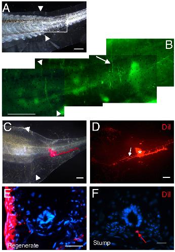 Figure 4. Peripheral nerve fibres in tail regenerates. (A) 1 month old tail regenerate. (B) Neurofilament 200 staining, enlarged view from the section in (A). Arrow indicates a neurofilament 200 positive nerve fibre. (C) Bright field image of a one week old tail regenerate, after DiI injection. (D) Red fluorescent image of (C), * marks the injection site of DiI, white arrow indicates a DiI-labelled nerve fibre. (E, F) The DiI signal is not found in neurons of the regenerating spinal cord (E) but is found in neurons of the proximal stump (red arrow in F). Arrow heads in (A-C) mark the amputation levels. Scale bars: 500 μm in (A-B); 250 μm in (C, D) and 20 μm in (E, F).