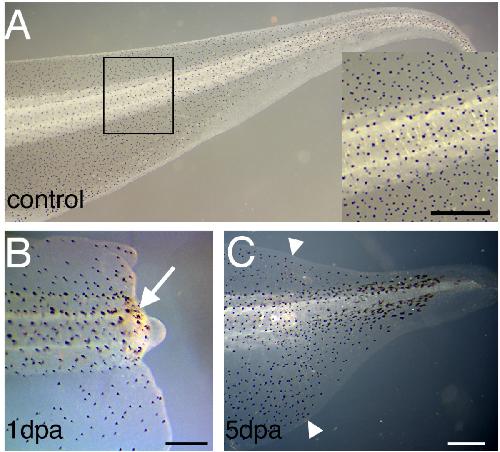 Figure 5. Regeneration of pigmentation in Xenopus tadpoles. (A) Pigment pattern of a stage 49tadpole. The inset is an enlarged view of the amputation level. (B) A regenerating tail 1 day post amputation (dpa). The white arrow indicates the melanophores near the surface. (C) A regenerating tail 5 dpa.