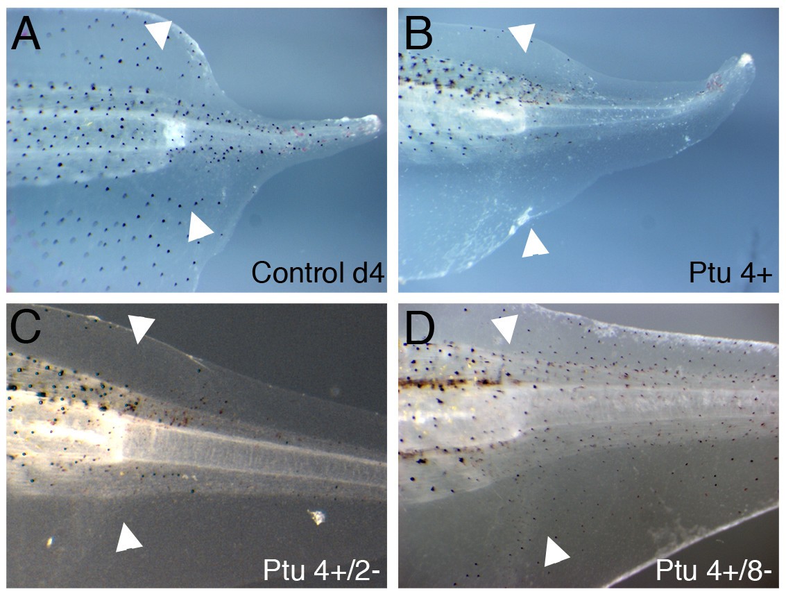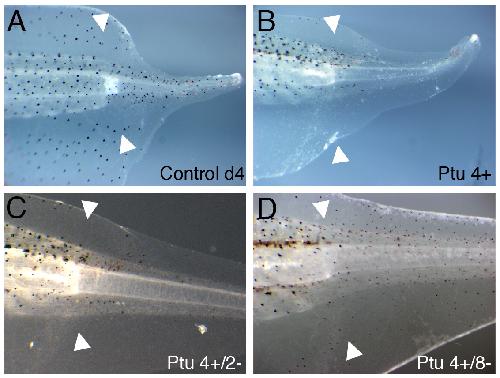 Figure 9. Tail regeneration in Phenylthiourea (PTU) treated tadpoles. (A) Untreated 4 day tail regenerate. (B) Tail regenerate of a tadpole treated with PTU for 4 days, starting immediately after tail amputation. (C) same tadpole as in (B), 2 days after PTU withdrawal. (D) same tadpole as in (B), 8 days after PTU withdrawal. White arrowheads mark the amputation level.