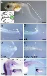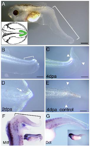 Figure 10. Tail regeneration in normal and neural crest-extirpated tadpoles. (A) A tadpole developed from a neural fold-extirpated embryo. The white bracket indicates the tail region with its pigment cells and dorsal fin depleted. The inset is a sketch of a stage 15/16 embryo, the green area marking the posterior neural fold removed. (B) A tadpole immediately after amputation. The white bracket indicates the region free from melanophores. (C) The same tadpole as in (B), 4 days after tail amputation, arrowheads indicate amputation level. (D) A tadpole with reduced number of melanophores close to the tail amputation level, 2 days after amputation. Arrowheads indicate amputation level. (E) A control tadpole, 4 days after amputation. White arrowheads indicate amputation level. (F, G) In situ hybridization of mitf (F) and dct (G) in neural fold extirpated tadpoles. Brackets mark the melanophore-free region of the tail. Scale bars, 500 μm.