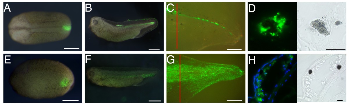 Figure 6. Tail regeneration after embryonic grafting of neural crest or of posterior ventral epidermis+mesenchyme. (A-C) A piece of GFP transgenic posterior neural crest was grafted to the same positions in wild type hosts. The labelled embryos were grown to tadpoles (B), amputated at stage 48 and allowed to regenerate for 7 days (C). Red lines indicate the amputation level. (D) A single melanophore in a regenerated tail from such an experiment, with contracted pigment and abundant GFP in the cytoplasm. (E-H) Similar experiment with graft of posterior ventral epidermis+mesenchyme (PVEM). In (H) is shown a section of the regenerate with two melanocytes, neither of which is labelled. White scale bars 500 μm; black scale bars, 20 μm.