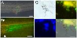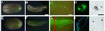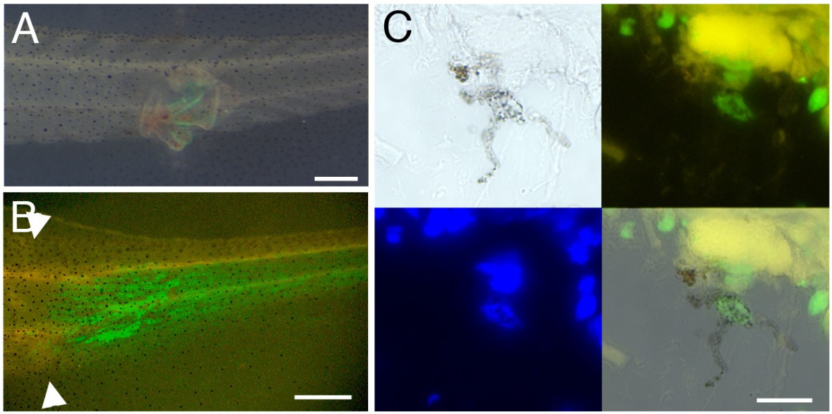 Figure 7. Regeneration of melanophores after skin grafting in tadpoles. (A) A piece of GFP-labelled skin was grafted to the lateral region of the middle trunk of a non-GFP tadpole host, which was then amputated 3 days after. (B) A 7 day tail regenerate from a skin grafted tadpole, white arrowheads indicate the amputation level. (C) Detection of GFP in a melanophore in the regenerate. 4 views are shown: top left transmitted light; top right GFP fluorescence; bottom left DAPI fluorescence (DNA); bottom right transmitted light and fluorescence. Scale bars: 500 μm in A, B, 10 μm in C.