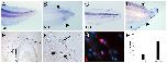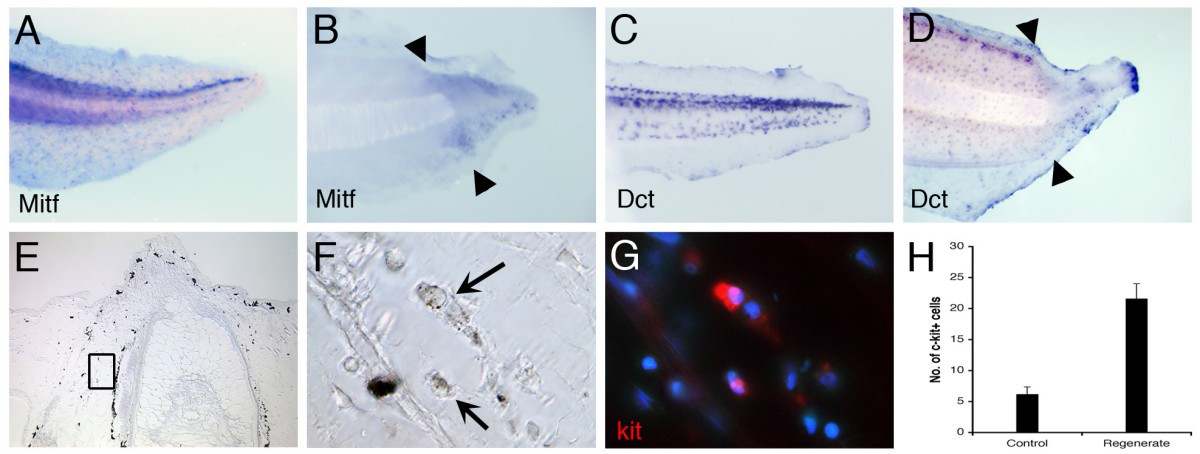 Figure 8. Detection of mitf, dct and kit expression. (A-D) Expression of mitf (A, B) and dct (C, D) transcripts in normal tadpole (A, C), and 3d tail regenerates (B, D) detected by in situ hybridization. Positive cells are present in the blastema region of the regeneration bud. Black arrows indicate amputation level. (E-H) Detection of kit in tail regenerates. Enlarged view of the selected area in (E) is shown in (F). The kit antibody staining is shown in red, and counterstained with DAPI (G). (H) Quantification of kit+ cells in the stump and regenerating tails, n = 6.