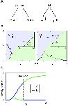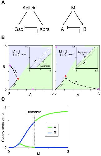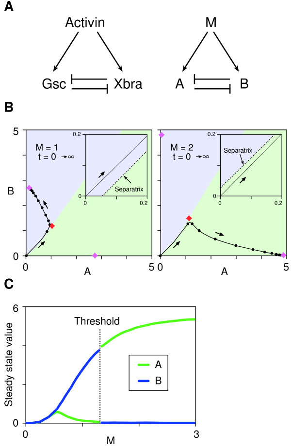 Figure 1. Bifurcation and thresholds in a simple network with a mutual negative feedback motif. (A) Activin, Xbra and Gsc form a network in which Xbra and Gsc are both induced by activin and can inhibit each other's expression. This network can be abstracted into a general network consisting of M, A and B as illustrated. (B) Trajectory of the phase point in the phase plane (A, B). The behaviours of the network fall into three categories (see Additional file 1). These panels show a typical example of bifurcation with a threshold. The phase plane is divided into two basins (blue and green) by a border (separatrix) and each basin has one stable point (node). The phase point moves as indicated by the arrows. Movement of the phase point is analogous to a ball rolling in a landscape (the phase plane), which features a summit (saddle point: red diamond) and a ridge (separatrix). These features cause the ball to roll down into one low point or the other (nodes: purple diamonds) in each basin. The position of the separatrix depends on the value of M, with the initial phase point (0, 0) in the blue basin when M is below the threshold (left panel) or in the green basin when M is above the threshold (right panel). Insets show magnified views of the initial point. Black dots indicate the position of the phase point with interval of t = 0.5. Purple diamond, nodes; Red diamond, saddle point. (C) Steady state values of (A, B) are plotted against M. The threshold is between M = 1 and M = 2. The parameter values used for the simulation are ka = 5.5, kb = 5.4, α = 6, β = 3, kda = kdb = 1.