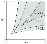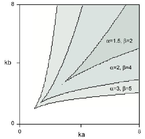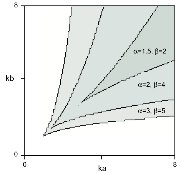 Figure 2. A plot of the area in the parameter plane (ka, kb) that allows the system to bifurcate. Bistability requires the balanced rates of synthesis of A and B (ka and kb). The product of cooperativity of the mutual repression between A and B must be greater than 1 (i.e. αβ > 1) for the system to bifurcate. μ = 3, kda = kdb = 1.