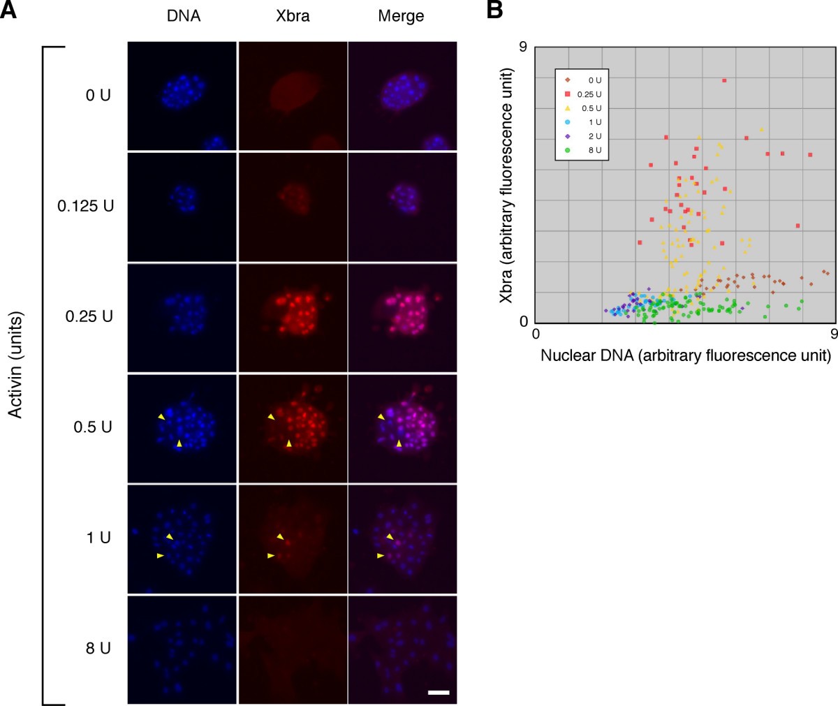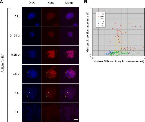 Figure 6. Heterogeneous expression of Xbra in Xenopus animal pole blastomeres. (A) Heterogeneous expression of Xbra in Xenopus animal pole blastomeres treated with uniform concentrations of activin. Dissociated Xenopus animal cap cells were treated with various concentrations of activin as indicated. The cells were fixed and stained by indirect immunofluorescence using an anti-Xbra antibody. Yellow arrowheads indicate the nuclei that are Xbra-negative among positive nuclei (0.5 U) or vice versa (1 U). Cells were counterstained with Hoechst33342 (DNA). Scale bar = 50 μm. (B) Plot of Xbra versus DNA fluorescences. The fluorescence was quantified as described in Methods.