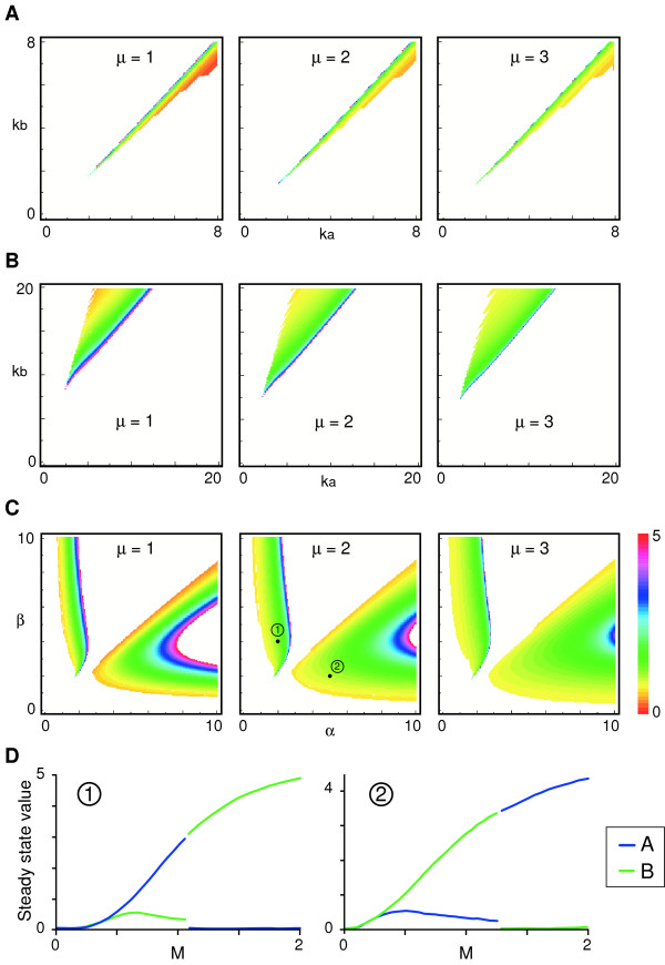 Figure 3. Relationship between parameters and threshold values of M. Threshold values are calculated and plotted and colour-coded as indicated. White areas indicate either that a threshold does not exist or that its value is above 5. (A) Threshold values are plotted in parameter plane (ka, kb). α = 6, β = 3, kda = kdb = 1. (B) Setting different values for the decay constants kda and kdb significantly broadens the range of possible parameter values of ka and kb that allows a threshold generation. Degradation constants are set to kda = 1 and kdb = 5. Note that the area in the parameter plane (ka, kb) that allows threshold (coloured area) is shifted and becomes much broader compared to (A). α = 6, β = 3. (C) Threshold values are plotted in parameter plane (α, β). ka = 5.5, kb = 5.4. (D) Steady state values of A and B plotted against M at the black dots in (C). Left panel, (α, β) = (2, 4). Right panel, (α, β) = (5, 2). ka = 5.5, kb = 5.4, kda = kdb = 1. Note that the two areas in (C) where the system is bistable with a threshold shows opposite steady state profiles. When α < β (area 1 in the middle panel in C), A is on and B is off with low M, and vice versa with high M at steady state. When α > β (area 2 in the middle panel in C), B is on and A is off with low M, and vice versa with high M at steady state.