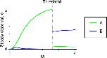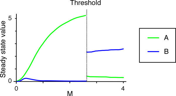 Figure 4. Typical example of threshold creation when cooperativities of repression α and β are equal. Steady state values of A and B are plotted against M when α = β = 3, (ka, kb) = (6, 14) and (kda, kdb) = (1, 5), μ = 2.
