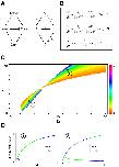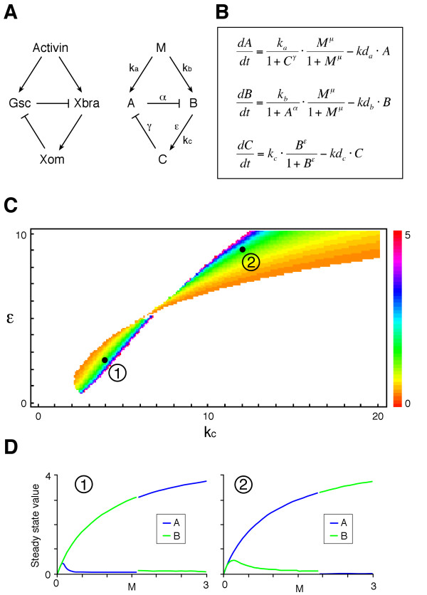 Figure 5. A mutually repressive network with an additional element. (A) The homeobox-containing transcription factor Xom mediates the repression of Gsc by Xbra. The gene network can be abstracted into a general network consisting of M, A, B and C as illustrated. (B) Ordinary differential equations describing the dynamics of the network in (A). ka, kb and kc are respectively the rates of synthesis of A, B and C. α and γ are the cooperativities of repression by A and C, ε and μ are the cooperativities of induction by B and M, respectively. kda, kdb and kdc are the decay rate constants. The dynamics of A and B are similar to those in Additional file 1 and show bistability. (C) Simulations were performed with ka = kb = 5 and α = γ = 3 (μ = 1, kda = kdb = kdc = 1). Threshold values of M, which are colour-coded, are plotted in the parameter plane (kc, ε). kc and ε determine how the value of C changes over time. There are two areas in the parameter plane where the system is bistable with a threshold. With smaller values of kc and ε (area 1), B is on and A is off with low M, and vice versa with high M at steady state. With larger values of kc and ε (area 2), A is on and B is off with low M, and vice versa with high M at steady state. (D) Typical examples (black dots in (C)) of steady state values of A and B plotted against M. Left panel, (kc, ε) = (4, 2.5). Right panel, (kc, ε) = (12, 9). If smaller values of kc and ε are favoured in nature, the above observation may explain why at steady state and with low activin Xbra (which corresponds to B) is on and Gsc (which corresponds to A) is off, and vice versa with high activin.