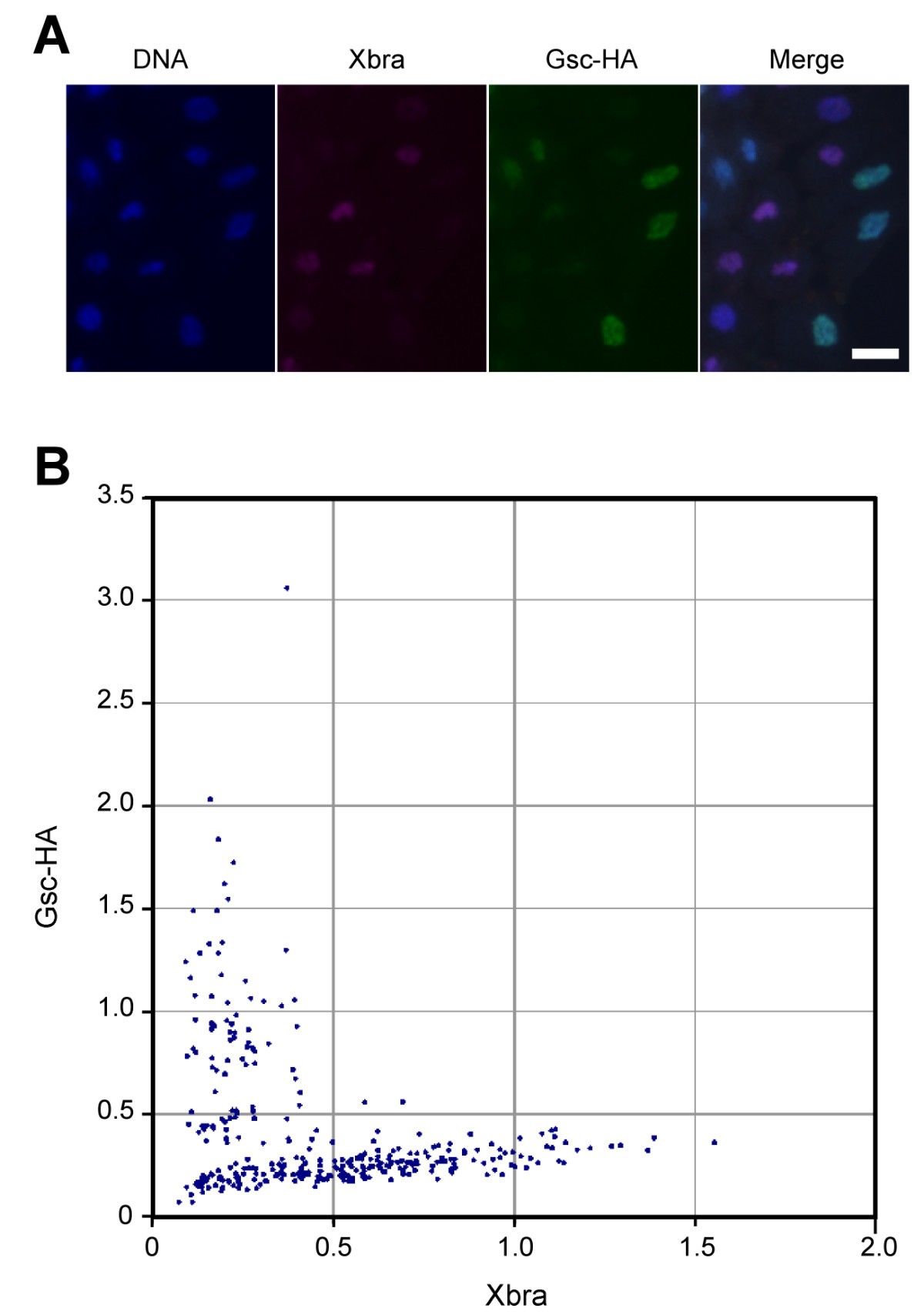 Figure 7. Mutually exclusive expressions of Xbra and Gsc in Xenopus animal pole blastomeres. (C) Mutually exclusive expressions of Xbra and Gsc in Xenopus animal pole blastomeres. Fertilised Xenopus embryos were injected with RNA encoding HA-tagged Gsc (Gsc-HA). Animal pole regions derived from these injected embryos and from uninjected embryos were mixed, dissociated and treated with 0.5 U/ml of activin. They were fixed after 7 hours of culture and stained with Hoechst 33342 (DNA) and processed for anti-Xbra and anti-HA staining. Scale bar = 20 μm. (D) Arbitrary fluorescence levels of anti-Xbra and anti-HA (Gsc) staining shown in (C) were calculated as described in Methods.