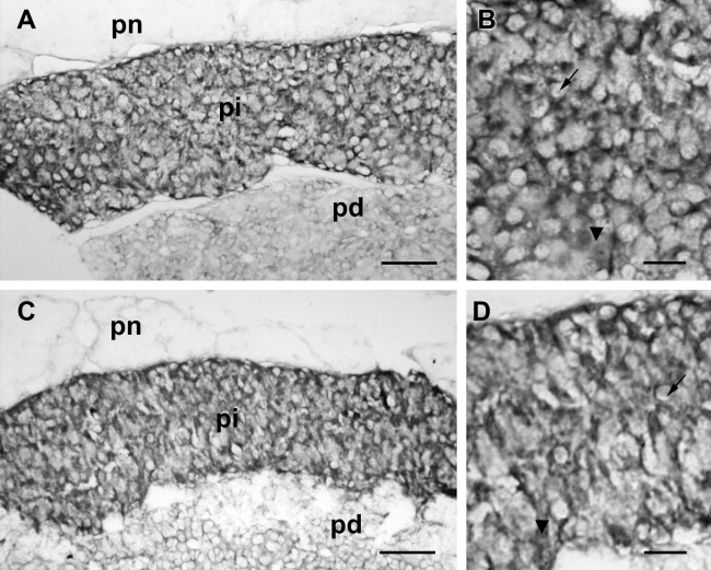 Brain-derived neurotrophic factor (BDNF) and alpha-melanophore-stimulating hormone (alpha-MSH) are co-sequestered in secretory granules in melanotrope cells of the pituitary pars intermedia of the amphibian Xenopus laevis. alpha-MSH is responsible for pigment dispersion in dermal melanophores during the process of black-background adaptation. BDNF-production in melanotrope cells is increased by placing animals on a black background, and BDNF acts as an autocrine stimulatory factor on the melanotrope cells. However, the repertoire of possible neurotrophin receptors of the melanotrope is unknown. In this study we have established the expression of full length TrkB (TrkB.FL), truncated TrkB (TrkB.T) and p75(NTR) receptors in the Xenopus neurointermediate lobe by RT-PCR. In situ hybridization reveals the presence of TrkB.FL mRNA and p75(NTR) mRNA in melanotrope cells. Quantitative RT-PCR shows that in animals on a black background the amounts of TrkB.T and p75(NTR) mRNA are about three times higher than in white background-adapted animals. We suggest that the amount of p75(NTR) sets the sensitivity of the melanotrope cells for the stimulatory action of BDNF during physiological adaptation to background light intensity.