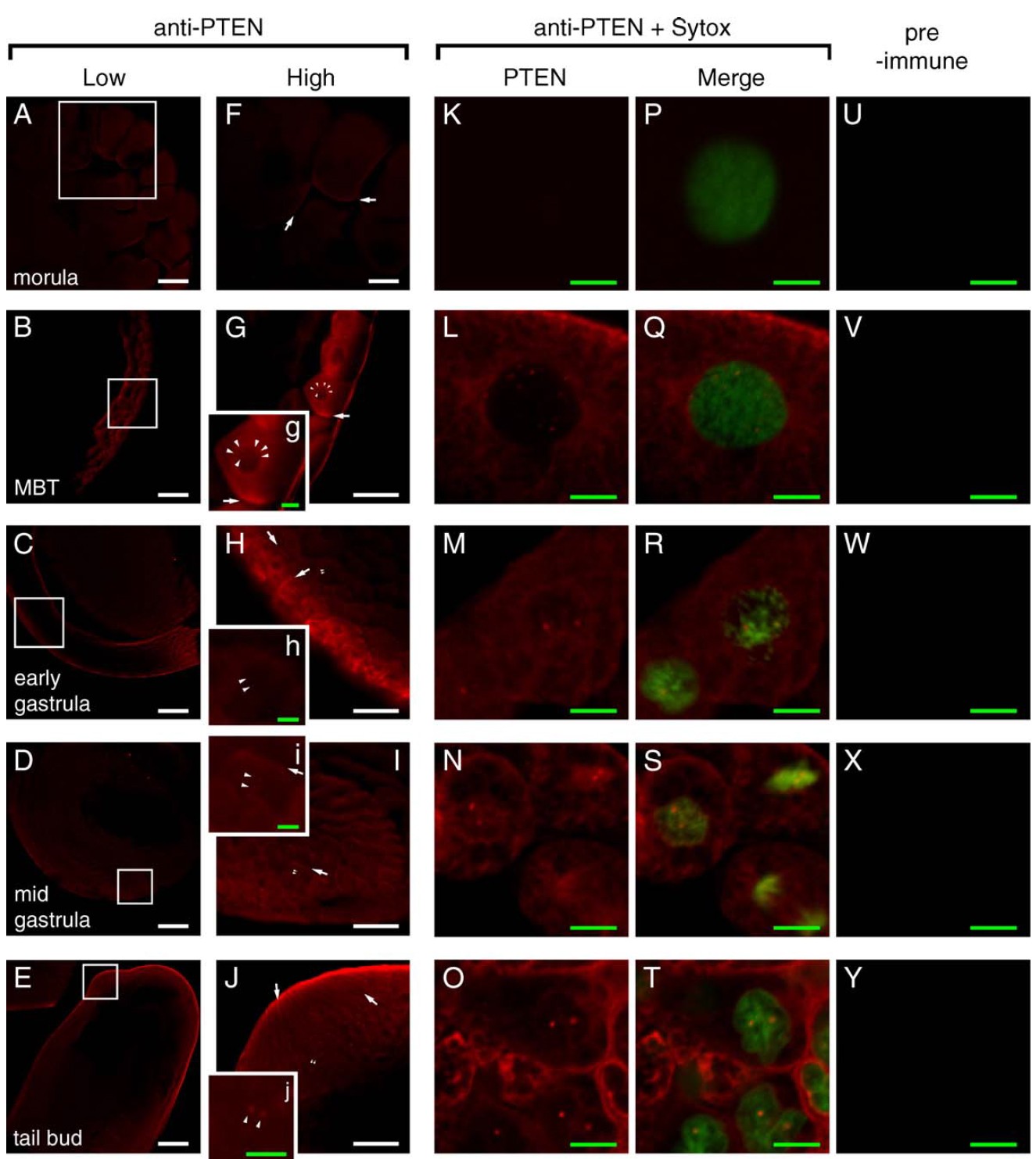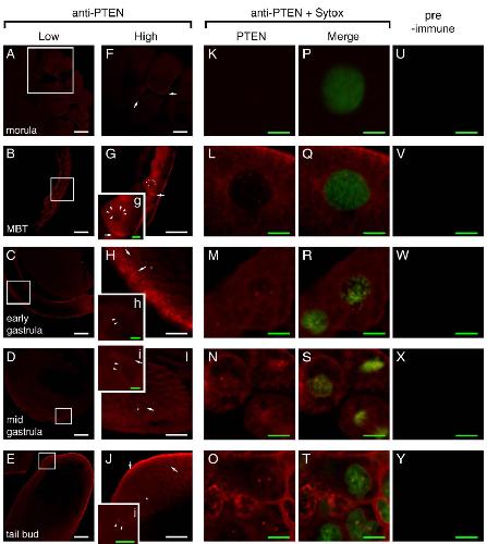 PTEN antibody. Optical cross sections of embryos at morula (N/F stage 6) (A, F, K, P, U), at MBT (stage 8.5) (B, G, L, Q, V), at early gastrula (stage 10) (C, H, M, R,