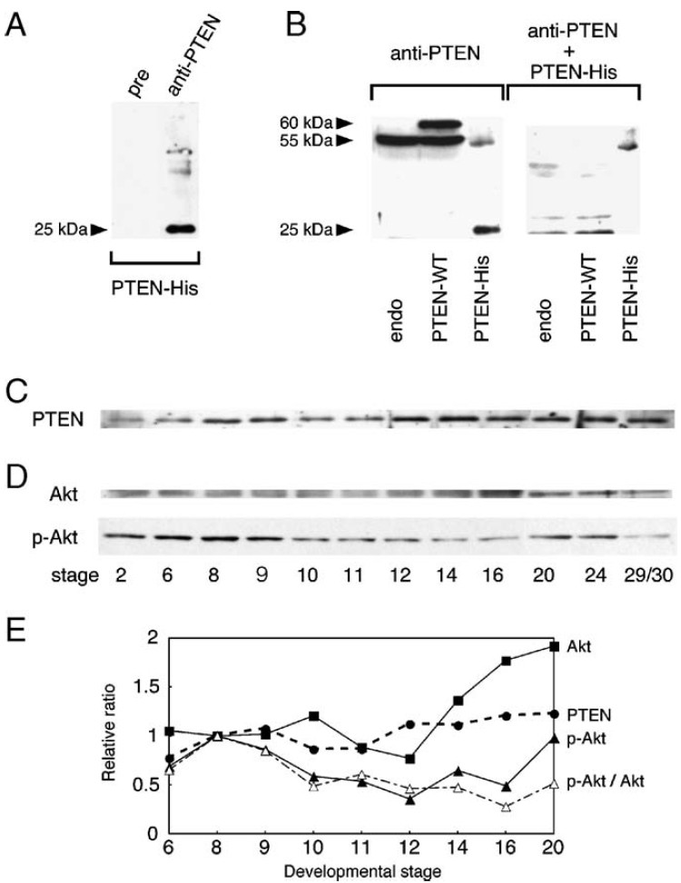 Fig. 1. Changes in expression and activity of PTEN during embryogenesis. (A) The anti-Xenopus PTEN antibody (anti-PTEN) recognized PTEN protein by Western blot, but pre-immune serum (pre) did not. (B) PTEN antibody specificity. The anti-PTEN recognized endogenous PTEN (endo), exogenous PTEN (PTEN-WT), and bacterially expressed PTEN (PTEN-His) whereas the anti-PTEN that had been mixed with PTEN-His (anti-PTEN+PTEN-His) did not recognize them. (C) The constant expression of PTEN proteins. Proteins equivalent to one embryo were analyzed by Western blot with anti-Xenopus PTEN antibody. (D) The changes in PTEN activity. Akt expression and Akt phosphorylation (p-Akt) were analyzed by Western blot with anti-Akt antibody and anti-P-Ser474 of Akt antibody. PTEN was activated during gastrulation (stages 106). (E) The relative change in the amount of PTEN, Akt, p-Akt, and a ratio between p-Akt and Akt, based on the amount at stage 8 (n = 3). Nieuwkoopaber (N/F) stages are shown at the bottom.