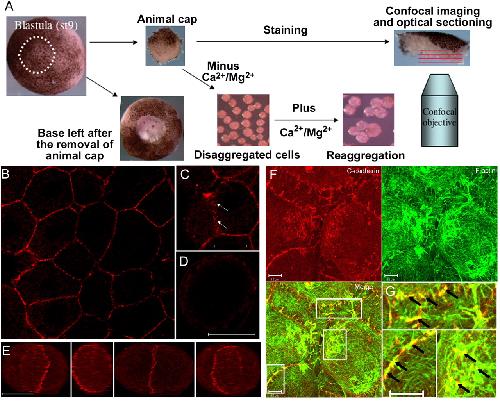 Fig. 1. Expression of C-cadherin and its colocalization with cortical actin skeleton at the late blastula stage in Xenopus. (A) The assay system used in these experiments. (B) TCA-fixed animal caps were stained with an anti-C-cadherin monoclonal antibody (6B6) and visualized by Cy5-conjugated goat anti-mouse IgG. Shown here is an optical slice of a cleared animal cap imaged by LSM confocal microscope. Positive staining appears along cell-cell contacts as discrete punctae. (C) A grazing optical section in the plane of a cell membrane shows punctae en face (arrows). (D) Cells disaggregated in calcium- and magnesium-free saline lose surface cadherin. (E) Upon addition of calcium and magnesium, cells start to reaggregate. Two aggregating cells are shown at different angles. The membranes lining the site of initial adhesion between the cells produce punctae containing C-cadherin. (F) Cells on the blastocoelic surface of the animal cap stained with monoclonal antibody 6B6 against C-cadherin (red) and phalloidin. The two images are merged in the lower-left panel. Yellow areas indicate colocalization of F-actin and C-cadherin. (G) The areas outlined in the merged image shown at high magnification. Arrows highlight colocalization of F-actin and C-cadherin. Scale bars: 20μ m in A-E; 10 μm in F,G.