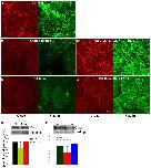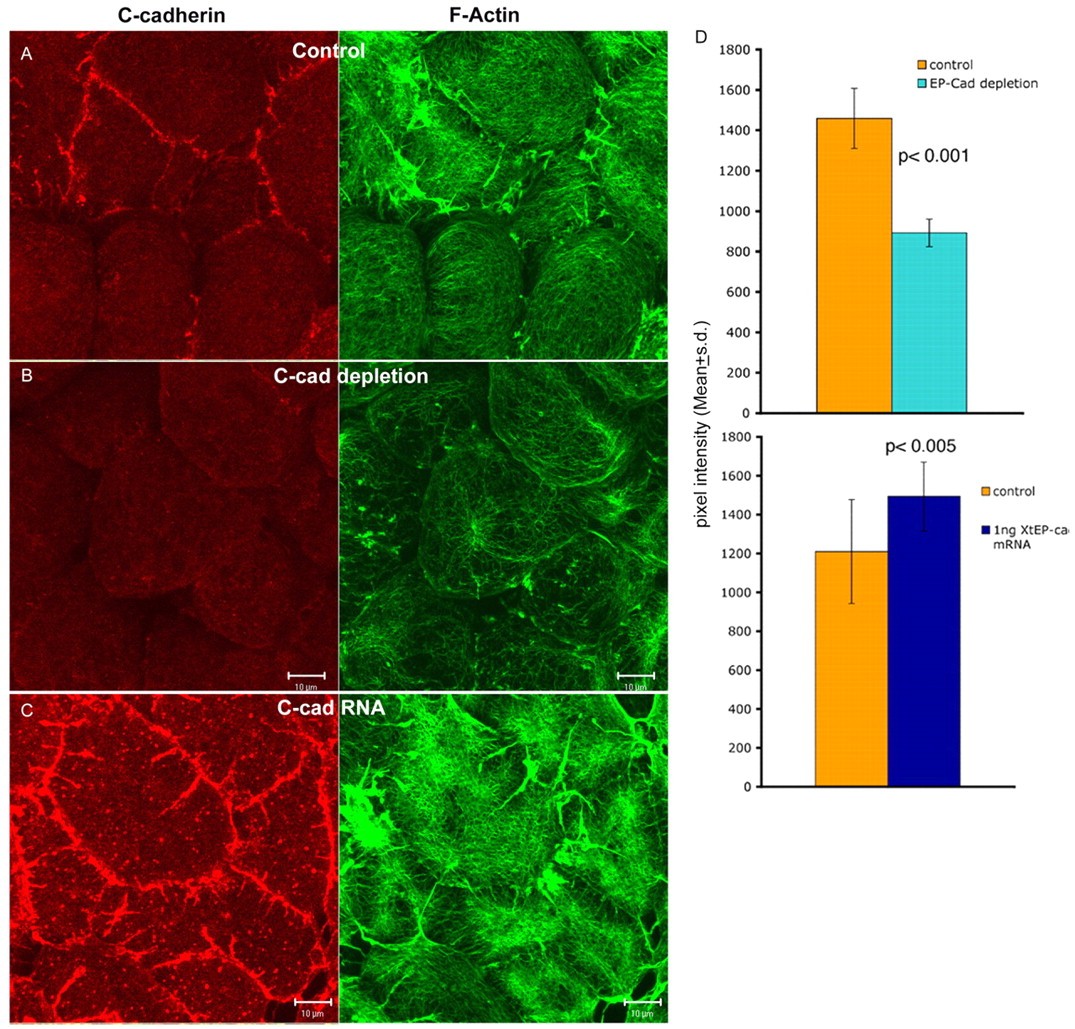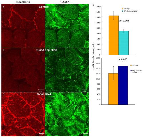 Fig. 2. The density of cortical actin depends upon the level of expression of C-cadherin at the cell surface. (A-C) Pairs of images from double-stained (C-cadherin, red; F-actin, green) animal caps. (A) Control levels of C-cadherin and cortical actin. (B) An animal cap from a Xenopus embryo depleted of C-cadherin by antisense oligo injection into oocytes. (C) An animal cap from an embryo overexpressing C-cadherin. Cortical actin is increased when C-cadherin is overexpressed and decreased when C-cadherin is depleted. (D) Quantitation of the cortical actin by measurement of pixel intensity. Scale bars: 10 μm.
