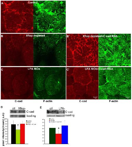 Fig. 8. Depletion of Xflop or LPA receptors causes reduced C-cadherin expression and reduced cortical actin assembly that can be rescued by C-cadherin mRNA. (A-Câ²) Pairs of images (left, C-cadherin staining; right, F-actin staining) from Xenopus embryos that were untreated (A), Xflop-depleted (B), or LPA1 and LPA2-depleted (C). Both cadherin staining and cortical actin assembly are reduced by Xflop and LPA1/2 depletion. The effects of each depletion can be rescued by subsequent injection of C-cadherin mRNA (Bâ²,Câ²). (D,E) Cortical actin levels were quantitated by pixel intensity. *, P<0.01. Insets are western blots showing that depletion of Xflop (D) or LPA1/2 (E) receptors also reduced the total levels of C-cadherin.α tubulin was used as a loading control. Scale bars: 10 μm.