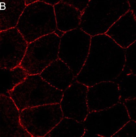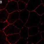 TCA-fixed animal caps were stained with an anti-C-cadherin monoclonal antibody (6B6) and visualized by Cy5-conjugated goat anti-mouse IgG. Shown here is an optical slice of a cleared animal cap imaged by LSM confocal microscope. Positive staining appears along cell-cell contacts as discrete punctae.