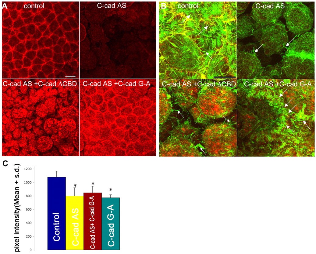 Fig. 4. The C-cad G-A mutant does not rescue dense actin assembly when endogenous C-cadherin is depleted. (A) When overexpressed, C-cad G-A was localized on the cell surface, but the C-cad δCBD mutant was trapped in the intracellular vesicles in Xenopus embryos depleted of C-cadherin. (B) F-actin (green) and C-cadherin (red) double staining shows that the C-cad G-A mutant did not rescue the dense actin assembly. Arrows denote actin-rich membrane processes. (C) Overall levels of polymerized actin quantitated by pixel intensity. *, P<0.05. Scale bars: 50 μm in A; 20 μm in B.