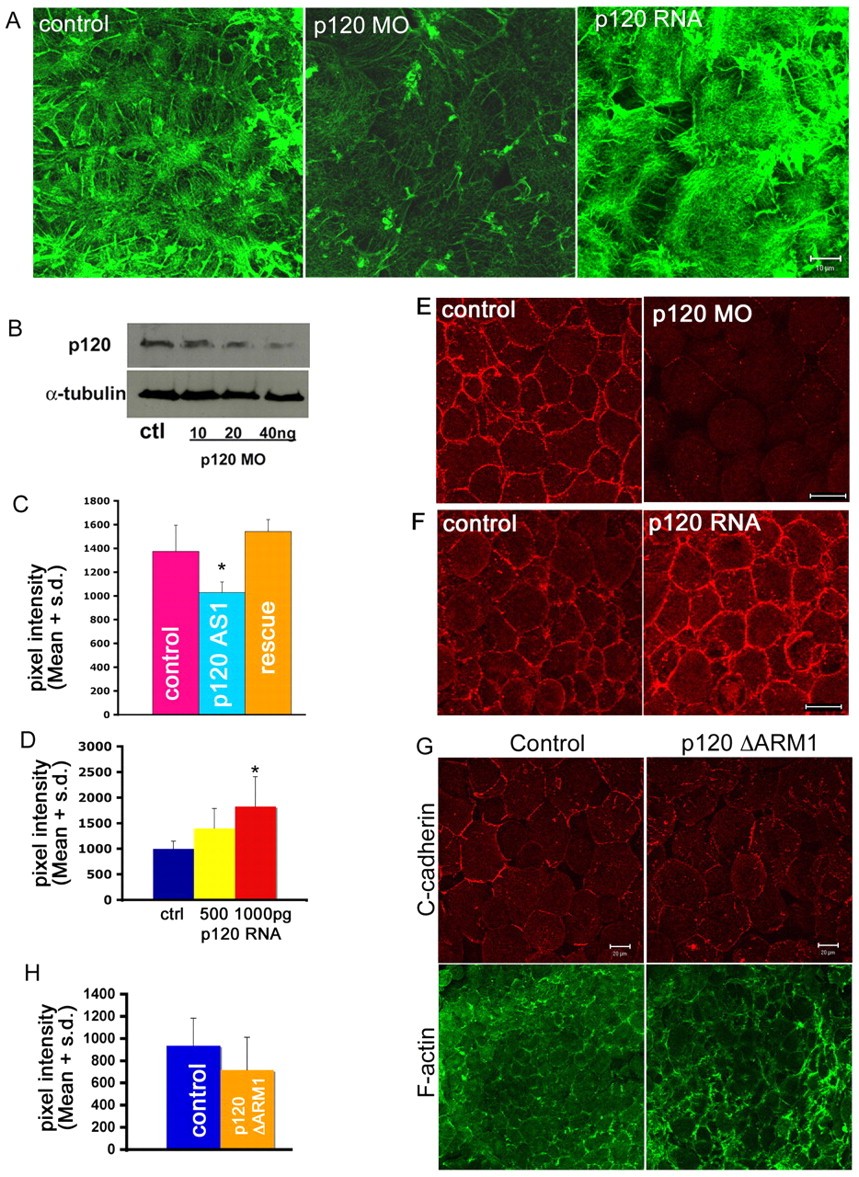 Fig. 5. p120 catenin expression levels control the level of C-cadherin expression at the cell surface and density of the cortical actin skeleton. (A) Representative images of animal caps from Xenopus embryos that were untreated (Control), depleted of p120 (p120 MO), or overexpressing p120 (p120 RNA). (B) Western blot showing the degree to which p120 protein levels are reduced at the blastula stage. (C,D) The changing levels of cortical actin, quantitated by pixel intensity, caused by p120 depletion by an mRNA-targeting antisense deoxynucleiotide oligo (AS1) and rescue by p120 mRNA (C) and increasing doses of p120 mRNA (D). *, P<0.05. (E) Images from C-cadherin-stained animal caps from untreated embryos (control) or p120-depleted embryos (p120 MO). (F) Images from untreated embryos (control) and embryos overexpressing p120 (p120 RNA). Depletion and augmentation of p120 cause decrease and increase in the level of C-cadherin at the cell surface, respectively. (G) A p120 mutant (p120 δArm1) that lacks the C-cadherin-binding domain has no effect on either cadherin or cortical actin levels. C-cadherin (upper panels, samples were fixed with 2%TCA) and actin (lower panels, samples were fixed with FG) staining are shown for animal caps from untreated (left panels) and p120 δArm1-injected embryos (right panels). No increase in C-cadherin or F-actin staining is seen. (H) Overall levels of F-actin caused by p120 δArm1 overexpression quantitated by pixel intensity. Scale bars: 10 μm in A; 20 μm in E-G.