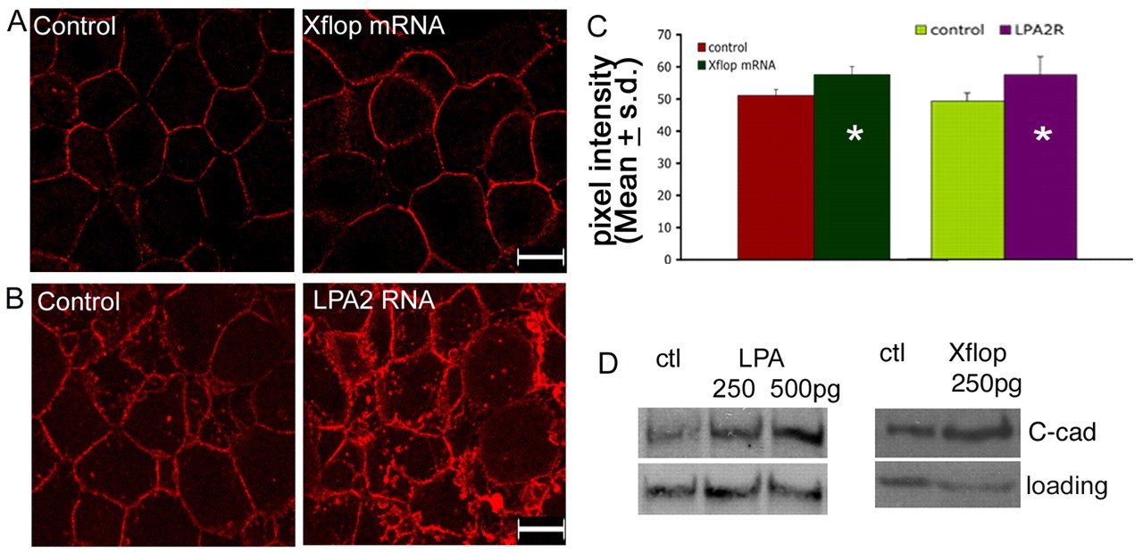 Fig. 6. Gain-of-function experiments show that the G-protein-coupled receptors Xflop and LPA2 control the level of C-cadherin on the cell surface. (A,B) Cadherin-stained animal caps from untreated animal caps (Control) and animal caps from Xenopus embryos injected with Xflop (A, right panel) or LPA2 (B, right panel) mRNA. (C) Quantitation of pixel intensity showing that both mRNAs increased the level of cadherin staining. *, P<0.05. (D) Western blot showing the increase in the total levels of C-cadherin caused by overexpression of Xflop and LPA mRNAs. α-tubulin was used as loading control. Scale bars: 20 μm.